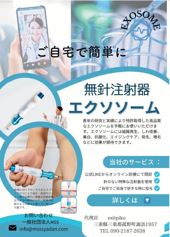|針のない特殊な注射器を使用|ご自宅でご自身で好きな時に投与|長年の研究と実績により特許取得した高品質なエクソソームには組織再生、しわ改善、美白、抗酸化、エイジングケア、発毛、増毛などに効果が期待できます。